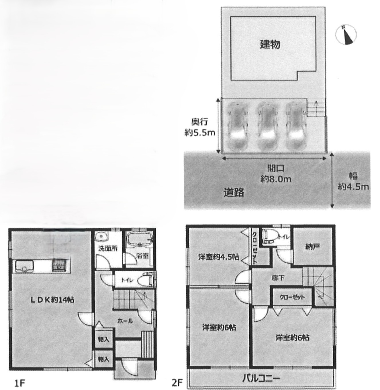 | 間取内容 | 1階LDK14畳1室 2階洋室6畳2室 2階洋室4.5畳1室 2階S1室 |