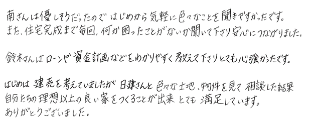色々な土地、物件を見て相談した結果、自分たちの理想以上の良い家を作ることが出来とても満足しています。」